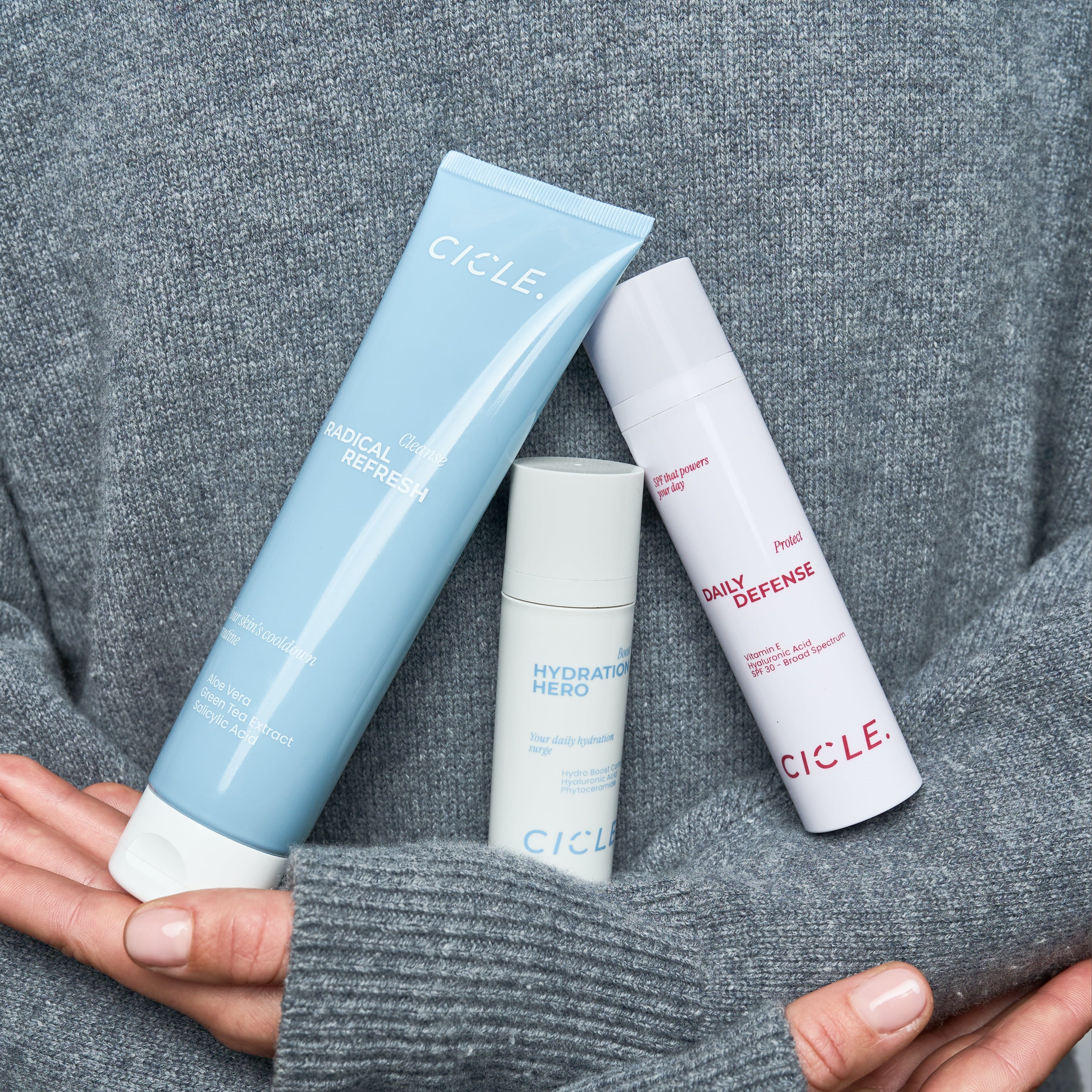 Post-workout skin faces three immediate challenges: congestion from sweat, barrier dehydration, and continued environmental exposure. Radical Refresh clears heat-stressed, congested skin, Hydration Hero rebuilds your moisture barrier, and Daily Defense seals protection. Complete post-workout recovery in three steps.